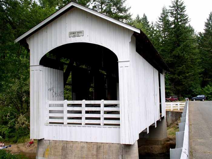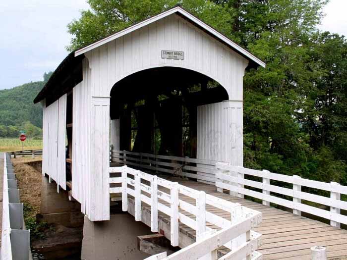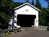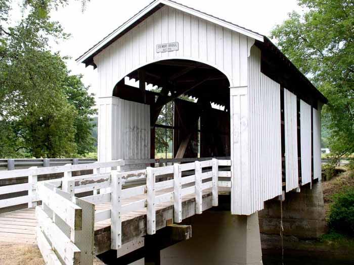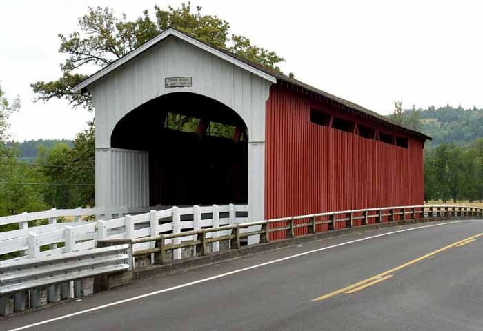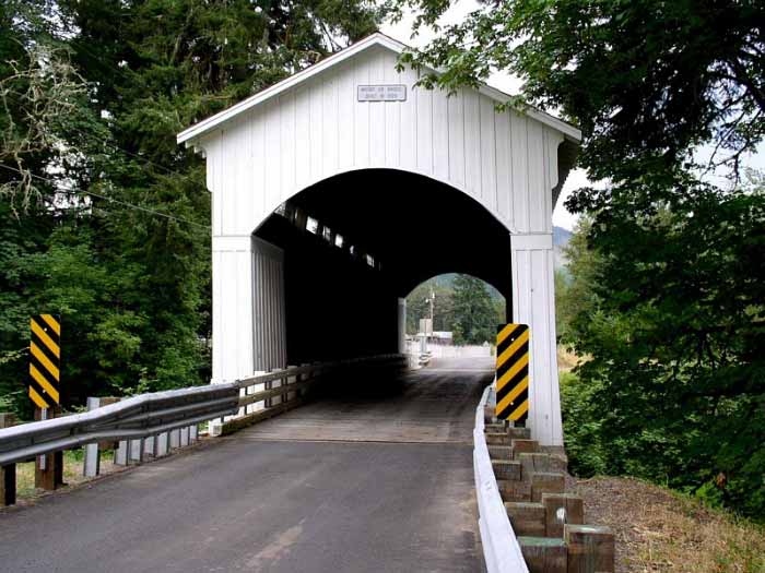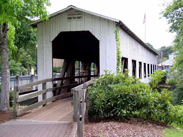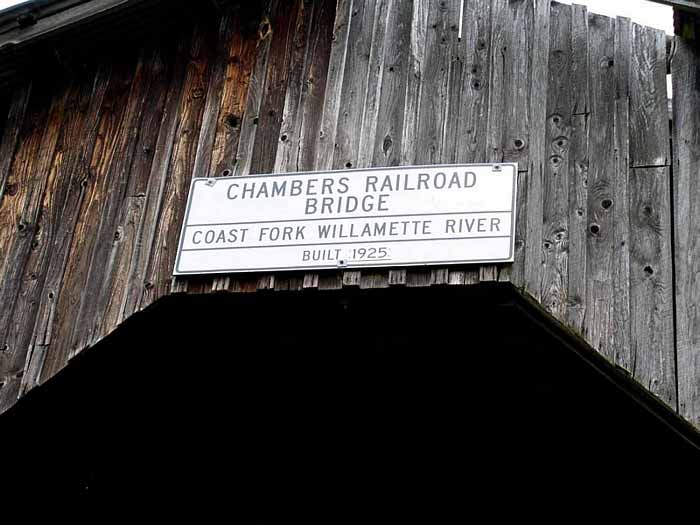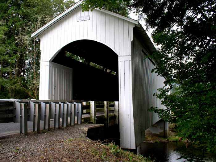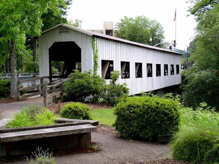 A few blocks from Main Street on South River Road, just past Harrison Avenue, this bridge is the only remaining covered railroad bridge in Oregon. It was built in 1925 to bring logs to the J.H. Chambers Mill in Cottage Grove. The bridge is 78 feet long. |