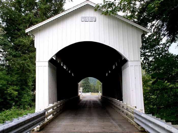 The Mosby Creek bridge, on Layng Road, was built in 1920 The 90 foot span is the oldest surviving covered bridge in Lane County, and the only local covered bridge open to traffic. The Mosby Creek bridge was restored in 1990. |
