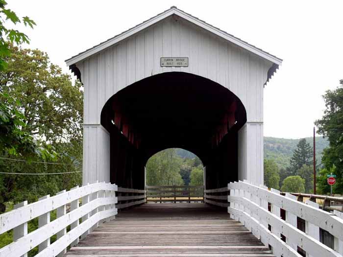 | The Currin covered bridge was originally built in 1925 and was remodeled in 1995. It too is located on Layng Road and spans 60-feet across the Row River. |