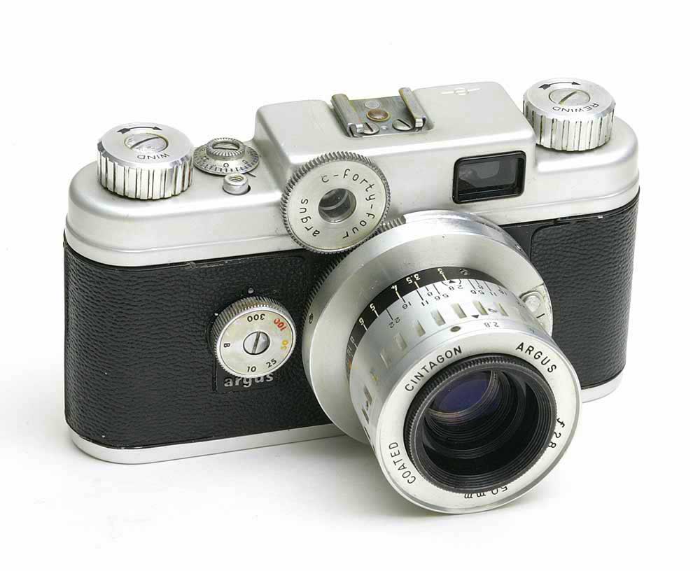 ARGUS C44THE CAMERA: This is a very cool looking camera! The C-44 is preceded by the C3 then C4. It was produced in 1956-1957 in Ann Arbor Michigan. It looks like they were in competition with Leica and other German made cameras of the time. Available with interchangeable lenses, simple color coded settings for point and shoot capabilities and it has a sturdy construction. The very fine Cintagon lenses were made for Argus by Steinheil in Munich Germany. This is a very collectable, hard to find camera. I had read about it after acquiring my Argus C3 and saw one on eBay with only a few hours left and one bid for $5, I held on and surprisingly got it for $15! certainly my best deal yet on my collection. Very few cosmetic problems, very good condition, lens and rangefinder are clear, shutter fires on all speeds and the aperture is smooth. It is not the quietest camera I own though. Some experts say the Bayonet mount lens system is a joke and a pain in the butt to juggle camera and lens to try and swap the lens but I have had no problems at all with removing and installing the lens. It's pretty simple, just put the camera on infinity, hold the camera in one hand and press a lever/button and turn lens at same time with other hand. Sure by today's standards it's awkward or maybe compared to a more expensive German brand of the time.