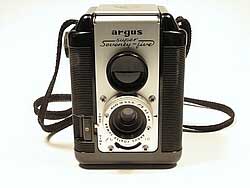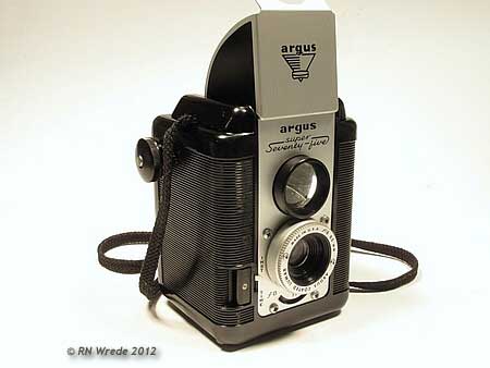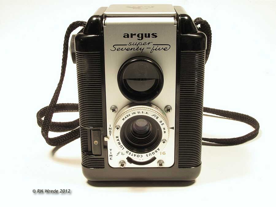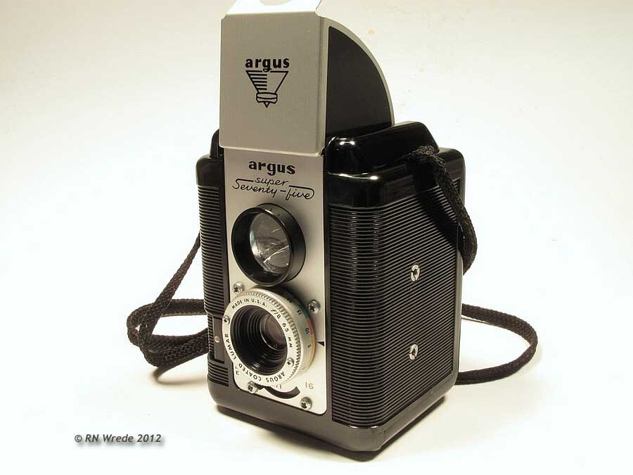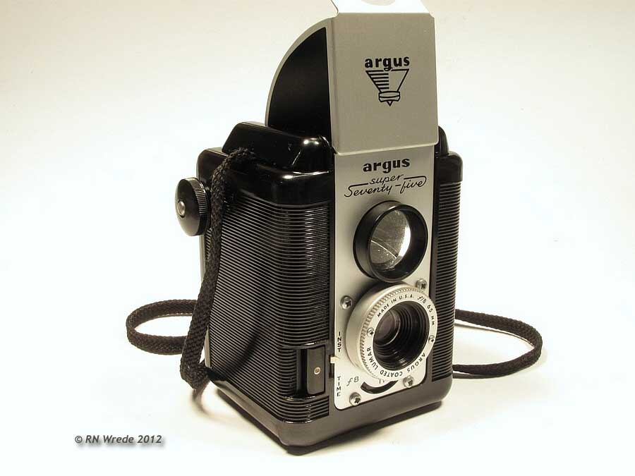 ARGUS 'SUPER SEVENTY-FIVE'THE CAMERA: I got this camera along with the Petri 7s at a flea market, also for $10. It was in excellent shape, even the strap, which is embedded into the camera, looks new. a little cleaning is all it took. Made in between 1954 and 1958, this camera was their top of the line TLR at the time. It has a crystal clear lens you look down into, as opposed to a frosted glass, which is desirable to me and others for using in my TtV photography. FIXES: Cleaned the surface with Meguiar's Leather Foam. I've discovered the Meguiar's works great on Bakelite and just about everything. The foaming action gets deep into the crooks and crannies. Just wipe clean, no scrubbing. MANUAL: Argus Super Seventy Five owners manual