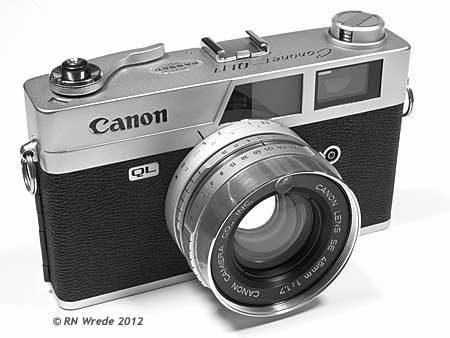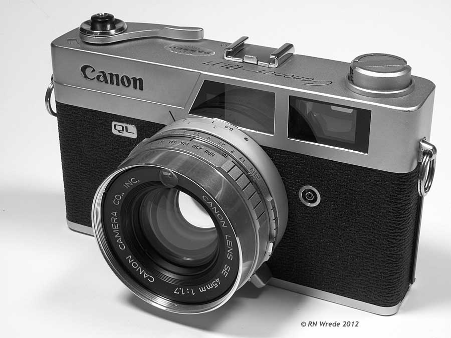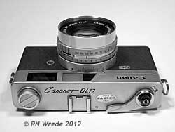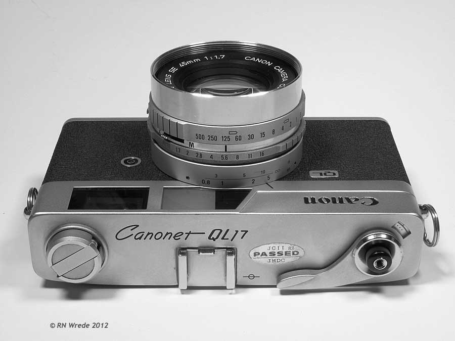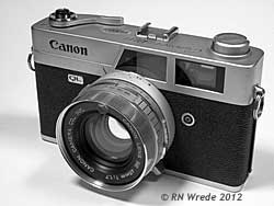 CANON CANONET QL17THE CAMERA: The official Canon website "Museum" says this camera is from the first phase and was introduced in 1965. Some of the identifiers are, it has no hot shoe and the PC connector is on the front next to the lens. My camera that came to me from eBay is an exceptional sample having very little external wear, the shutter and meter works on all speeds and the Auto works. Everything works, only small problem was the focus was ever so slightly off in the rangefinder. At infinity it actually went just past being lined up in the viewfinder When I took the top off to clean and adjust the rangefinder I noticed right away this camera is built much more sturdy and "professional" for lack of a better word, than the other models I've seen so far, except for maybe my Minolta Hi-Matic 7s, it runs a close second. It has glass not plastic windows on the top cover, the dust/light cover on the rangefinder is screwed down not glued down, it just has that look of quality about it inside and out FIXES: Aside from the difficult to remove retainer ring on the film advance lever, (yes I scratched it) it is the easiest camera I've dealt with so far. The top pops right off and no surprises and wires attached to the top to deal with or rotting foam light/dust seals. It looked very clean inside, no yellowing glue spots, oxidizing parts or what have you. I unscrewed the light/dust cover from the rangefinder housing and cleaned the glass optics with windex and Q-tips (don't touch the mirrored or colored glass with anything) then I played with the cool meter-in-viewfinder set-up. (side note: It's amazing how ingenious we as a society were before LED's and digital readouts. Sure it's electrical but the meter itself is all mechanical in the viewfinder with a "Mousetrap Game" set up from the galvanometer needle to the needle you see in the viewfinder.) I then adjusted the focus in the rangefinder, using the good guidance of Rick Oleson's page to see which screw to adjust. it was almost like just breathing on it, it was such a small adjustment. I will have to give it new light seals. I'm using some black cotton yarn in the door grooves, luckily the original 'velvet' light seals on the door hinge and clasp area ari still good, I would hate to mess around that quick load flap. Here is a test photo shot with this camera MANUAL: Canon Canonet QL17 owners manual (password = Pentax) [Camera Home] [SLRs] [Rangefinders] [Viewfinders] [TLR] [Meters] [Gallery] this site owned and maintained by R.Wrede,© all rights reserved. |