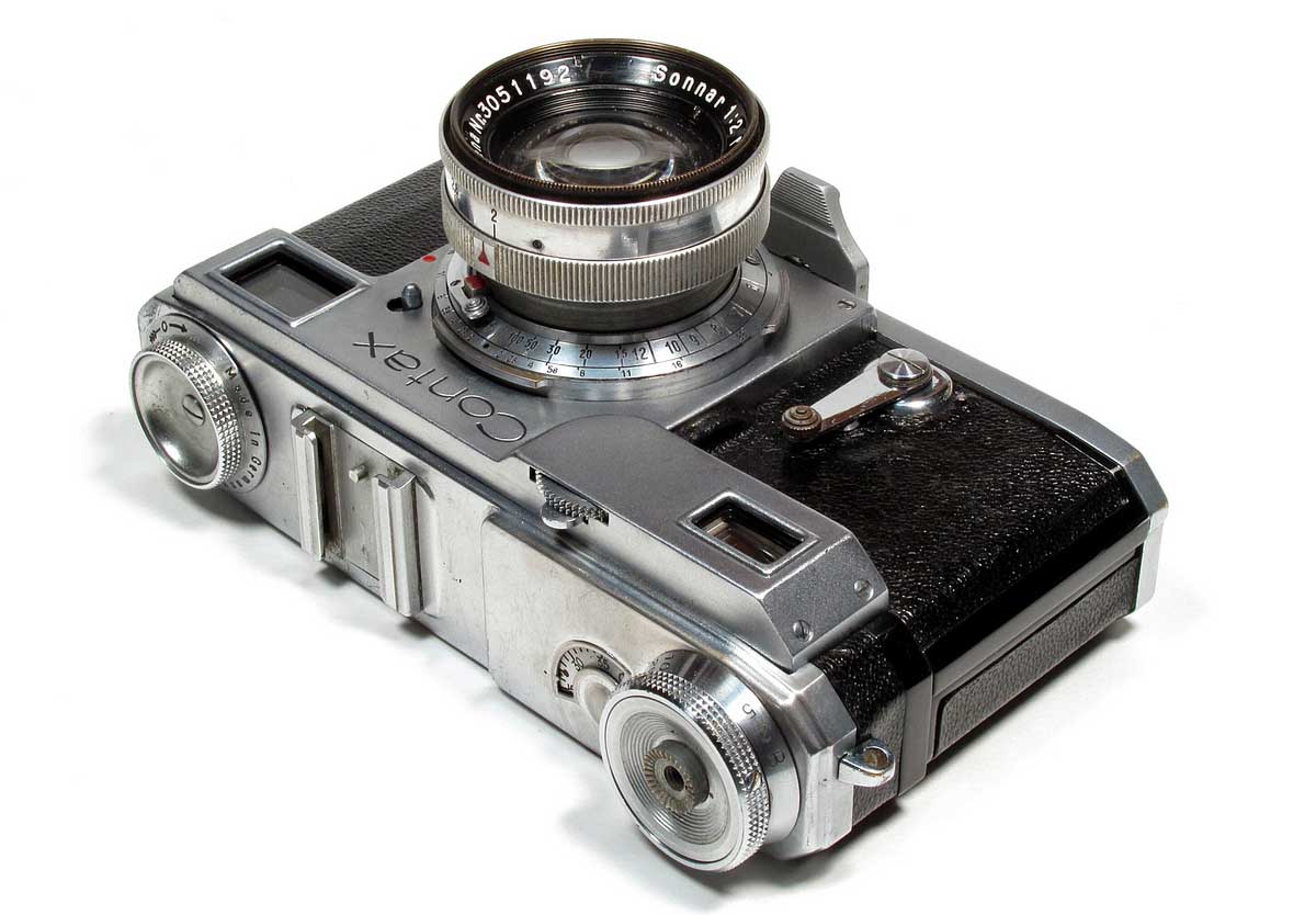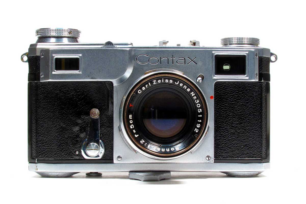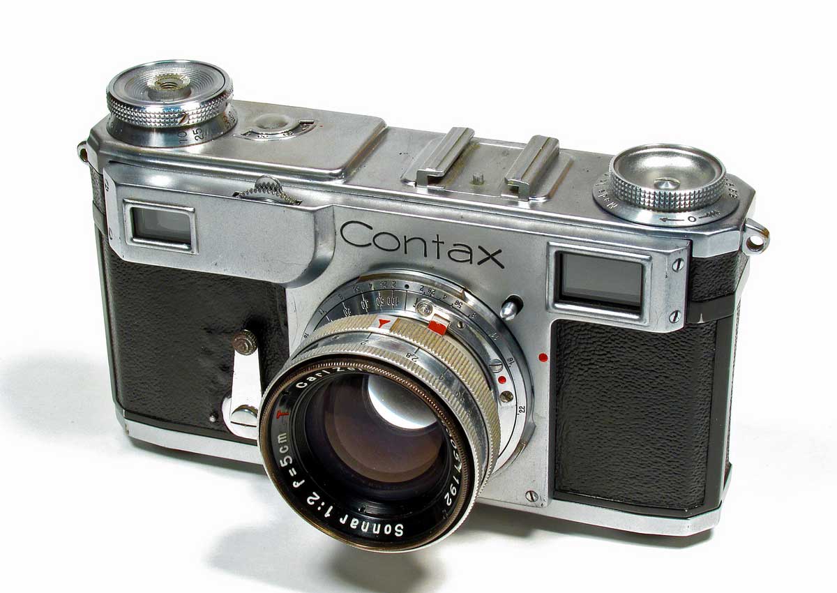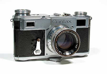 ZEISS IKON · CONTAX IITHE CAMERA: The Contax II went into production in 1936 until 1942. Mine is from 1937. Some will say the Contax series was superior to the Leica's of the time, I suppose it just depends on your likes. I personally prefer the Leica camera as a shooter but the Contax for it's looks. The wider more accurate rangefinder is a plus but it seems heavier and more clunky. I don't know, shoot, they're both nice. My Leica IIIa is whisper quiet compared to the Contax's I have. I got mine (body) for under $50 as an "as is, parts camera". Like I've said on other camera pages, I'm not afraid to buy "parts" cameras as I usually can fix them or, as like this camera, they only require a cleaning. I've gotten several cameras that there was nothing wrong with them but the seller didn't know about them so sold them "as-is. FIXES: I gave it as much of a CLA as I could without taking the actual shutter mechanism apart. I did remove the top, and shutter cradle and cleaned all the gears and escapements with lighter fluid and lubed a few choice gears. You can see the procedure I did on this Flickr Set. Thanks to the help of forum friends, I discovered the reason for the RF patch being off at infinity. On the front face plate, there are a total of 6 (visible) screws. 2 are shorter than the other 4. There are 2 screws each on the upper left and upper right. Someone had put longer screws on the left side where the moving optics for the RF would hit them at infinity. I replaced them with the 2 short screws. I cleaned the RF optics and gave it a good exterior cleaning. I used Kiwi shoe polish to make the leatherette pop! MANUAL: There is an online owners manual here.