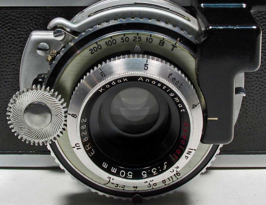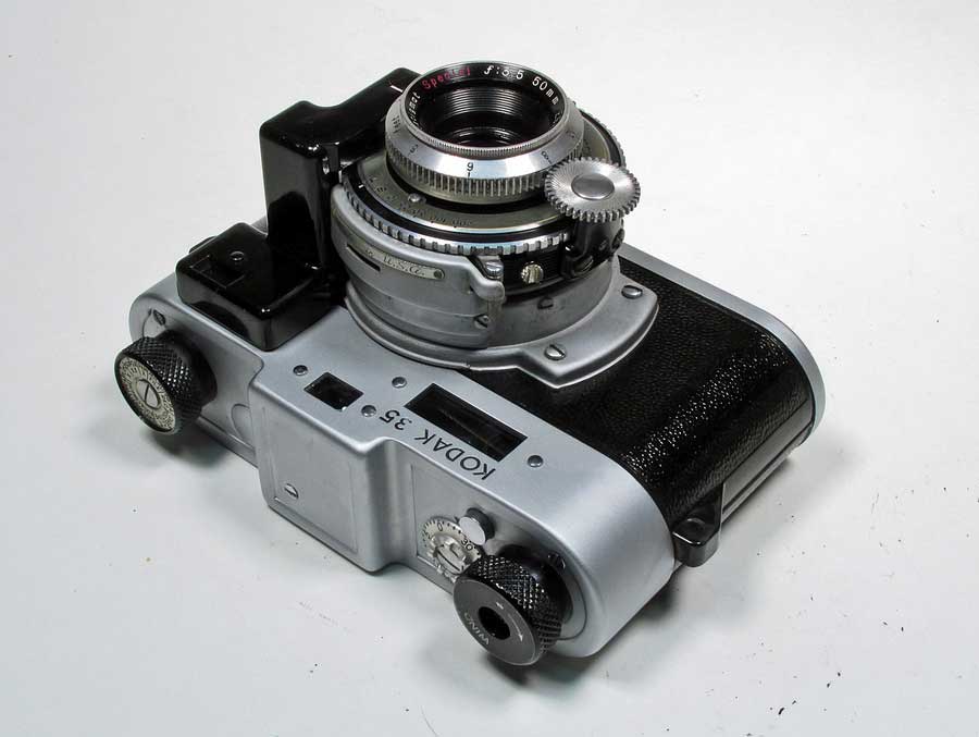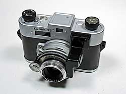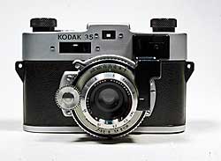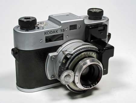 KODAK 35THE CAMERA: With a face only a mother could love, my Kodak 35 RF is from 1945 When I was doing a repair I had the top plate removed. It seemed rather cheaply manufactured. There are two mirrors on the top with a simple arm controlling one mirror as the arm inside the front protrusion is activated while turning the lens to focus. Probably to be competitive and make a profit is the reason for the stamped metal parts. It does sport a great lens though and the Bakelite body is in great condition too. FIXES: The main mirror had fallen off up in the top of the camera. I took off the top plate and glued the mirror back on and cleaned the rest of the optics and adjusted the infinity on the rangefinder. I also cleaned and lubed the film sprocket gears. I cleaned the exterior. MANUAL: Here is an online owners manual