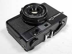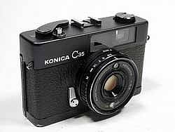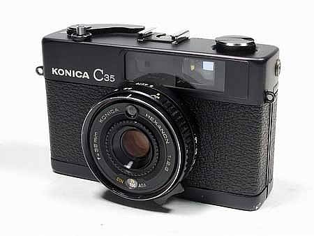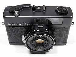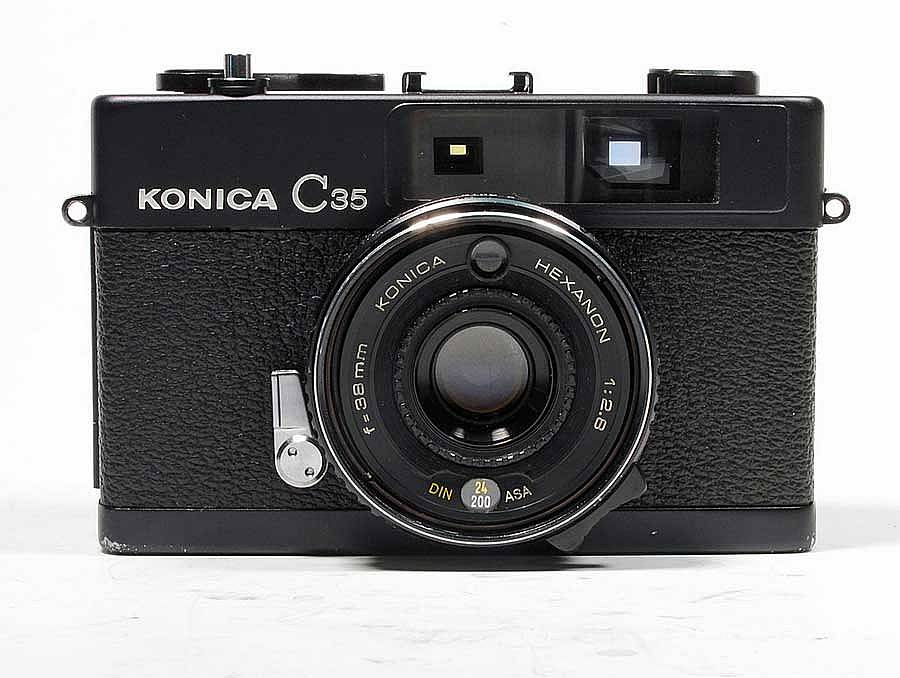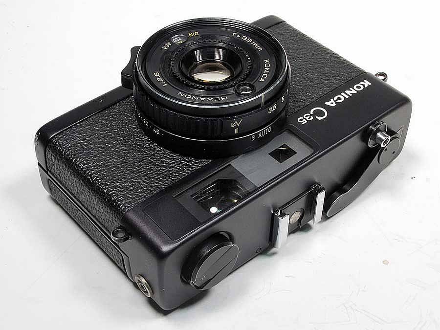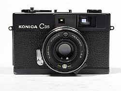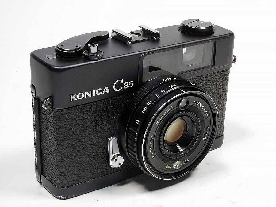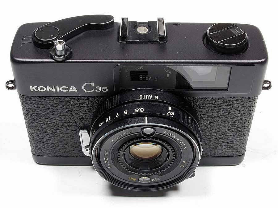 KONICA C35 in BLACK FINISHTHE CAMERA: The Konica C35 was manufactured starting in 1968 and has the Hexanon 38mm 1:2.8 lens. Fully Auto metering system. It came in chrome and black finish. I have a chrome version but it is somewhat of a hacked thing with wrong focus knob on the focus ring, CDS cell that's finicky and non-stock leatherette. I think the black version looked great and I have been looking for one but they usually fetch a higher price. I finally found one in good condition that I could afford ($7 on the bay) It was being sold as-is as a parts camera. I removed an ugly chrome finish and mighty beat up, ring on the front of the lens that the previous owner put on. It took me a while to figure it didn't even belong, but it was a blessing in disguise. Underneath was a nice clean stock filter ring that had been protected for years by the ring. It immediately reminded me of pulling up the old carpet and finding a beautiful hard wood floor underneath. It is in beautiful shape over all, just some chipping finish in the bottom plate, no scratches or nicks on top. That chrome ring had me worried at first because it protruded inward, making it impossible to remove the split-ring in the filter ring to replace the meter wiring. It just slipped off. . FIXES: I had to re-wire the battery-to-meter as it was all corroded. I had to clean the rangefinder optics and the infinity was way off. I also replaced the light seals which is a real chore for this camera. Here is a sample photo from this camera Manual: Konica C35 Manual