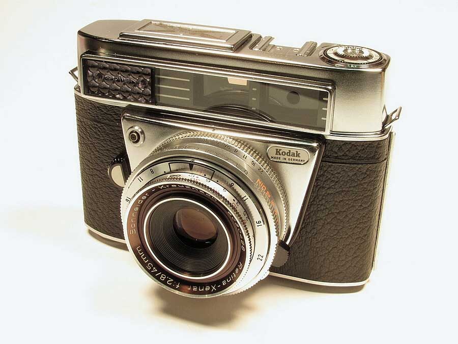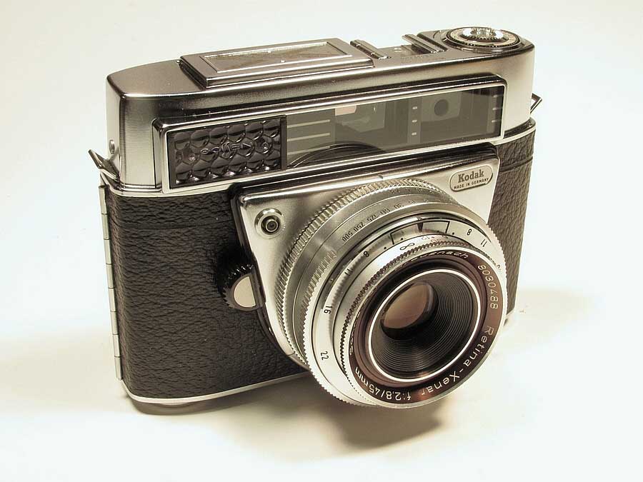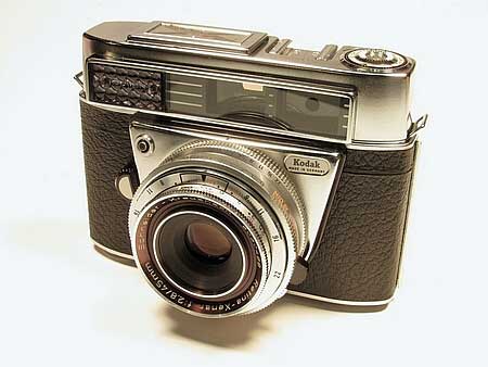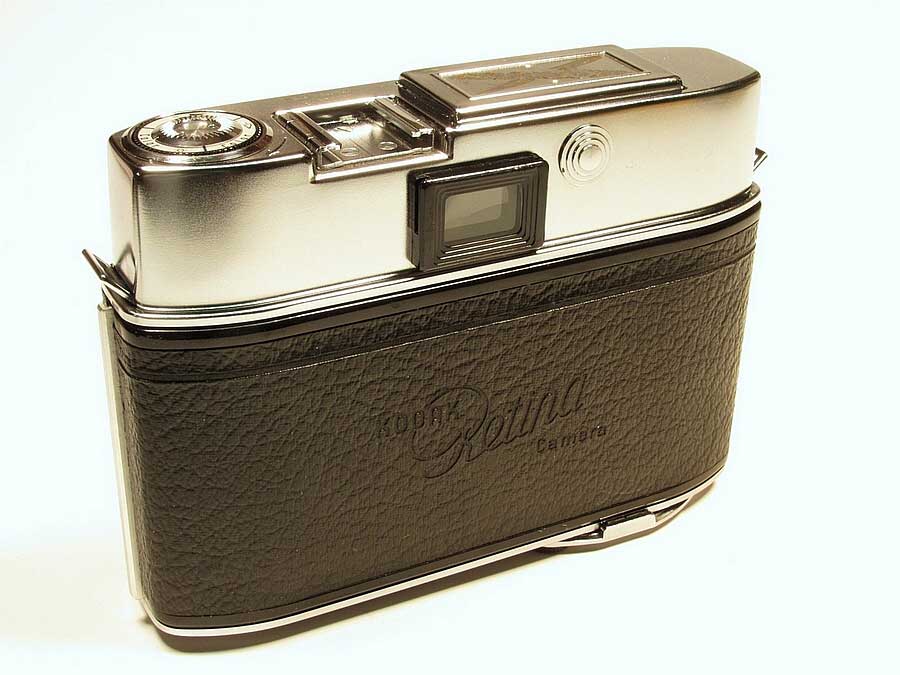 KODAK RETINA IIFTHE CAMERA: I hadn't really planed on collecting any Kodak's, mainly because I grew up thinking, like most people, that Kodak built cheap, instamatic, plastic cameras. Or the older brownie and box cameras. Not until recently when I started collecting did I realize there were quite a few very high quality Kodak 35mm cameras that were made in Germany from the 1930's through the mid 60's. I found my camera at an antique store several months ago but resisted mainly because of the $65 price tag, also because I hadn't any knowledge of the Retina line. Most Retinas are "folders" much like my Voigtlander Vito II but there are a few rangefinders too. The Retina naming and numbering system is difficult to figure out to say the least. Mine is a IIF, a rangefinder from 1963-1964. But a IIc is a folder. Also upper case and lower case is used, a IIc is a folder from 1954-1957 and a IIC is a folder from 1957-1958. Any hoo, I have never seen another IIF offered on eBay (until I got mine home) or any where else for that matter and it is a beauty in near mint condition. The store knocked 10% off and looking at others similar, it was a good buy. The shutter works on all settings as well as the meter. Even the all leather case is very cool, with chrome trim all around the edges, it reminds me of the interior of a 1960 corvette or something.