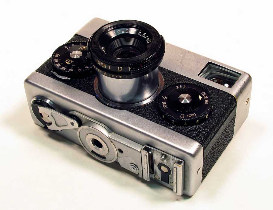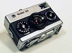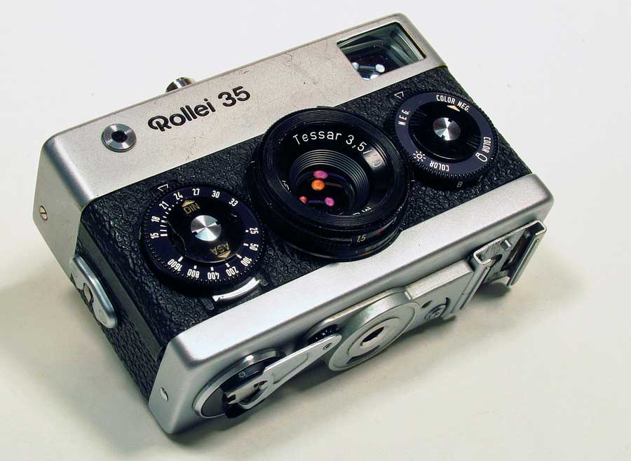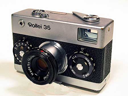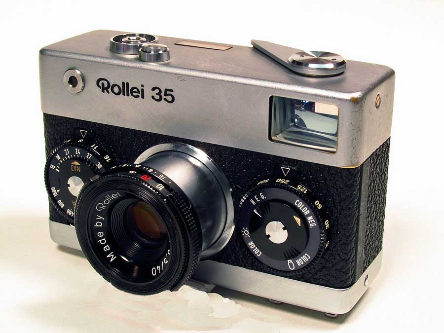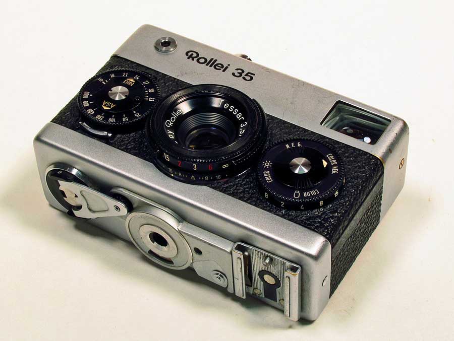 ROLLEI 35THE CAMERA: Found this at an estate sale for $5. I've been wanting one of these for a very long time but can't afford so when I saw the $10 dollar price tag on day 4 of an estate sale I was in shock because it was "half price day". I was actually shaking with good It's very heavy for it's size and built like a tank. A real marvelous feat of engineering. It's so different from any thing else, it's fun just to handle and tinker with. My version is made in Singapore around 1974 as it has a 600000+ serial number and the lens says "Made by Rollei" Tessar 3.5/40 instead of Carl Zeiss (but used Carl Zeiss components), as a way to reduce costs. There is a chip of plastic missing on the ASA dial and some signs of wear. It came with a hard to find and spendy Hoya UV filter. FIXES: I had to clean the oxidized battery contact for the meter to work and everything else works fine. a goos external cleaning, I use Meguiars Leather Foam to clean all my camera leatherette, it works good on old bakelite too. Here is an image from this camera