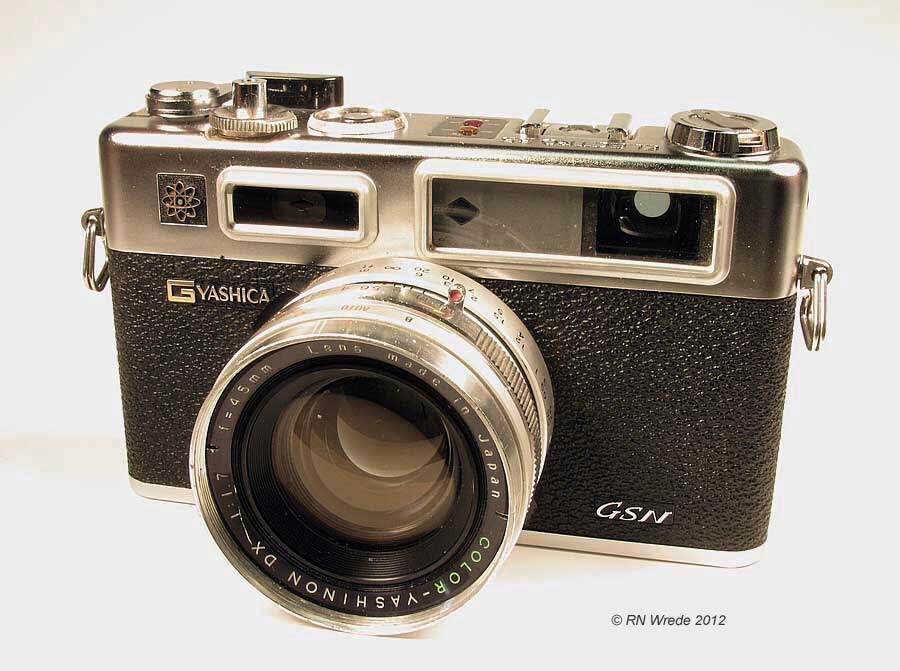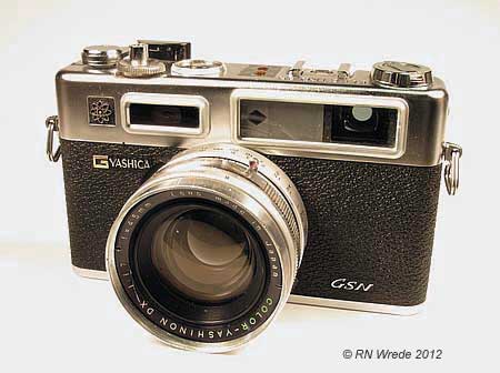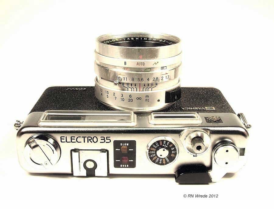 YASHICA ELECTRO 35 GSNTHE CAMERA: This was the first camera I've bought recently after reading up and getting hooked on vintage rangefinders. It was made in 1973 following the Electro 35 in 1966, the 35 G in 1968, and the 35 GS in 1970. I already knew it was a great camera as we had one in high school yearbook and newspaper class for the kids that didn't have their own camera and I had read about it's quality. But that was 35 years ago, recently reading about it I learned everybody that used it LOVED the quality of the images because of the huge 1.7 lens and the Auto exposure system that seemed almost magical. So I needed one. It took a while to get one on eBay that wasn't marked "Parts only" and was affordable. Many are going for $80-130 if stated "everything works, meter and shutter works as it should" I had to settle for "shutter fires not sure about meter, no battery to test ". Luckily the GSN has a default 1/500 shutter speed if the battery dies or is missing. The battery it takes originally was an obsolete PX32 5.6 Mercury, but it will accept 6v 28A or 4LR44 alkaline with an adaptor. The metering system (aperture priority) has a "under-over" system in which a yellow arrow means open the aperture more (or use a tripod) and a red arrow meaning close the aperture, (too much light) After getting an adaptor and battery I discovered what a lot of people discover with their nearly 40 year old camera, the metering system goes to a yellow arrow and the shutter stays open for 4-15 seconds or until you crank the film advance. More on that in Fixes below. I could have settled for the default 1/500 shutter speed but that would eliminate many shooting scenarios. Plus I am a tinkerer at heart, I just can't let things be. FIXES: I did some searching on the internet, GSN meter, GSN shutter not working... etc. I found some Forums and web sites that helped immensely. Why? because there seems to be a cult following for this little camera. Working on it was addicting. see links below. Battery: I got a 628 battery at radio shack, wrapped it in electrical tape to increase it's size (diameter, to center it) and got a spring at the hardware store. (see Matt's link below) but it had no battery test light. I took off the bottom cap and there was no corrosion there and the spring down inside looked fairly clean so I took the top off and inspected the bottom of the battery case from there. The wire at that end was corroded and broken off. It is almost impossible to reach in with a soldering rod so I took the battery case out from the bottom and soldered a fresh longer wire to it, put the battery case back in and soldered the other end. Viola, power, battery test light worked. but the meter gave me the yellow arrow and shutter open for ever syndrome. POD: Next I tackled the metering/shutter problem. There is this little thing called the POD or "pad of death" it is a rubber pad about 4mm x 5mm x 2 mm thick that is attached to the shutter rods. There are two shutter rods, one goes up through the top of the camera, this is what you press. It pushes a second rod (with POD between the point of contact) that actually releases the shutter and moves the electrical contacts for the metering system across a plate. Every article I read said it has to be 2mm exactly or the "yellow arrow syndrome" doesn't go away. I'm going out on a limb here and argue the fact that, after seeing the shutter rods and the electrical contacts in action, that a 1.8 or 1.9 mm POD thickness works better. (that's just the thickness of one of the lines on your ruler) I used a neoprene black washer from the hardware store. When you advance the film lever, one rod is released and with the help of a spring is pushed up against the POD and gives a "thump" ready for the next shot. So when you press the shutter release, the POD pushes against the second rod. Upon observation, a 2mm POD sets the contacts just too low on the contact board. They look like 5 gold plated fingers contacting a flat board with 5 gold plated runs. There are breaks in some of the board runs at different levels (of travel, sliding down the runs) At the uppermost level, where the fingers rest, (after advancing the film advance lever and the shutter rod pops up), with a 2mm POD the left most finger is just on one of those breaks, effectively touching two contacts (on either side of the break) With a 1.8mm POD the finger waits just above this break. There are instructions with pictures on how to tear apart the camera to fix this but a warning. It's not as tough as they said it was, especially putting the lens plate back on, not that bad so don't let it scare you. The biggest worry is not tweaking all the wires. I removed the brown wire attached to the flash socket on the top cap to make it easier. The "Yashica Guy's" instructions are great but his section about "screws A, B, C, E" weren't correct for my model/age of camera, I almost tore apart the counter mechanism for nothing but the rest is good. Just remove the one screw like Mick Feuerbachers page shows and you'll be good, his screw removal was more like mine (click his "Reordering of the site - camera repair etc. now in "articles" section" link, (upper right brown box), then click "Camera repair articles" then click "Pad replacement in Electro 35" (his site is in frames so a direct link is not possible) After getting it all put back together follow Monopix' instructions on how to adjust the shutter rods on the bottom of the camera. Also the Classic Camera Repair Forum was a big help as was Matt Denton's pages. Light Seals: When you have the top cap off, you'll notice two rotten black foam areas, One, a ring above the rewind crank rod. That's a dust cover for the viewfinder. Cut a piece of black felt about the size of a nickel then use a hole punch for the hole, then slip it over the rewind crank rod. The other is a small piece that goes near the red and yellow arrows to keep their light from getting into the rangefinder mirror a