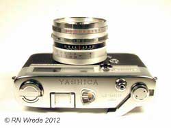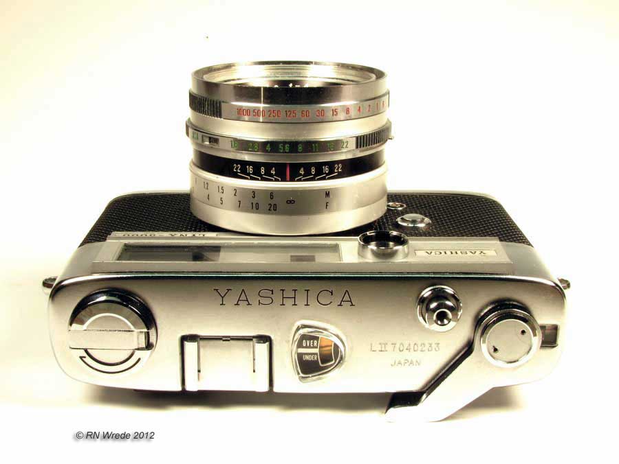 YASHICA LYNX 5000THE CAMERA: I got this beauty on vacation at an antique mall. I wasn't really looking for a Lynx but after picking it up and examining it I was hooked! It's almost in mint condition except for a few very minuscule scratches on the viewfinder window frame above the lens. It has the case, lens cap and original owners manual. I had read about it before so I knew it was a manually set exposure system. The meter aids only in setting the aperture and shutter and is not needed, it will operate without a battery! It has a whopping B+1s-1/1000 Copal-SV shutter! And a decent f1.8-f22 lens with a semi-coupled aperture/shutter, set them as you want and then you can move just the shutter ring and the aperture ring moves with it. The camera body is not as wide as my Electro 35 GSN, it seems more like a late model rangefinder from the mid 70's but it is a well ahead of it's time for a1962 camera. The original 1.35v mercury battery is obsolete, there are a few alternatives, I went with the 1.4 volt AZ675 zinc air battery from Walgreens, ($6.95 for 8) and a rubber 'O' ring (7/16 id x 5/8od) to hold it. I went with the cheapest. Plus there are already two tiny holes in the battery compartment cap to let them breath. FIXES: Battery: My almost mint camera came with a free used roll of film inside and an original mercury battery! Luckily when the battery popped out it took all it's ooze with it. (probably because of the air holes in the battery cap) Needless to say, upon inserting a battery, there was no power. A corroded wire I assumed and I was right. It was green and corroded all the way to the other end and not even attached. I had to open the top and bottom caps of the camera and removed the front leatherette and the lens plate. I soldered a new lead from the battery terminal to the meter button. I followed Yashica Guy's instructions. I suck at soldering but I managed to get it, the meter works now! Light seals: I used the same procedure as with my GSN. Black cotton crochet yarn shoved into the back cover plate grooves but no need for black felt near the hinge as the fuzzy fur was still good. When I had the top off to solder the battery wire, I also replaced the rotten foam ring on the film rewind crank shaft with a piece of black felt cut about the size of a dime and used a hole punch. There was also a strip of the rotten foam in the top cap that acts as a light break between the rangefinder and light meter I replaced with black felt strip. Here is a test photo shot with this camera. MANUAL: Yashica Lynx 5000 owners manual [Camera Home] [SLRs] [Rangefinders] [Viewfinders] [TLR] [Meters] [Gallery] this site owned and maintained by R.Wrede,© all rights reserved. |