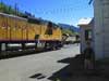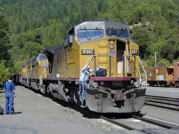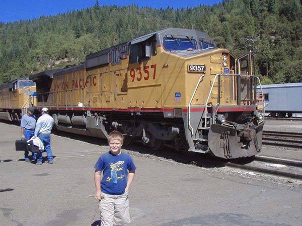 Just seconds after arriving, and getting the first helper shot, Chris yells out "Hey Dad, a Train!" Sure enough, and it was just creeping up slowly to the station, I knew we were in for a treat, a Crew change! Where else but in Dunsmuir, can you walk up and shake hands with the crew and walk up and down the train to get a close up view? You gotta get here! |