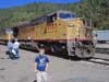 Chris was grinning from ear to ear, as was his Dad! A Dash-9 was in the lead and a "winged" SD-70 was second in the consist. |