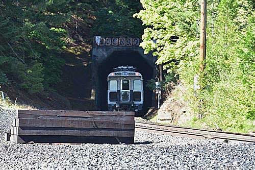 On __ the trailing car of the FRA inspection train entering the east portal of Tunnel 13. Photo courtesy of Menoah Hall